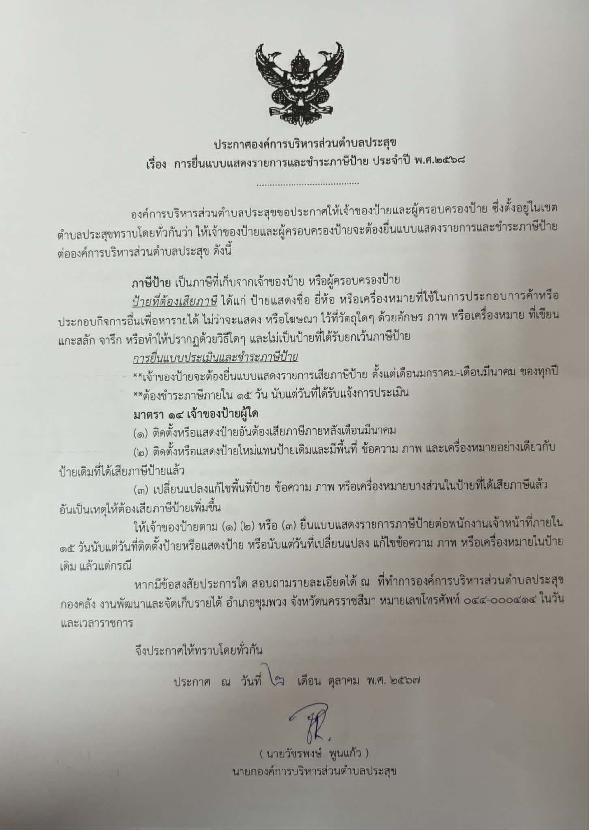 ประกาศองค์การบริหารส่วนตำบลประสุข เรื่อง วิธีดำเนินการประเมินและจัดเก็บภาษีป้าย