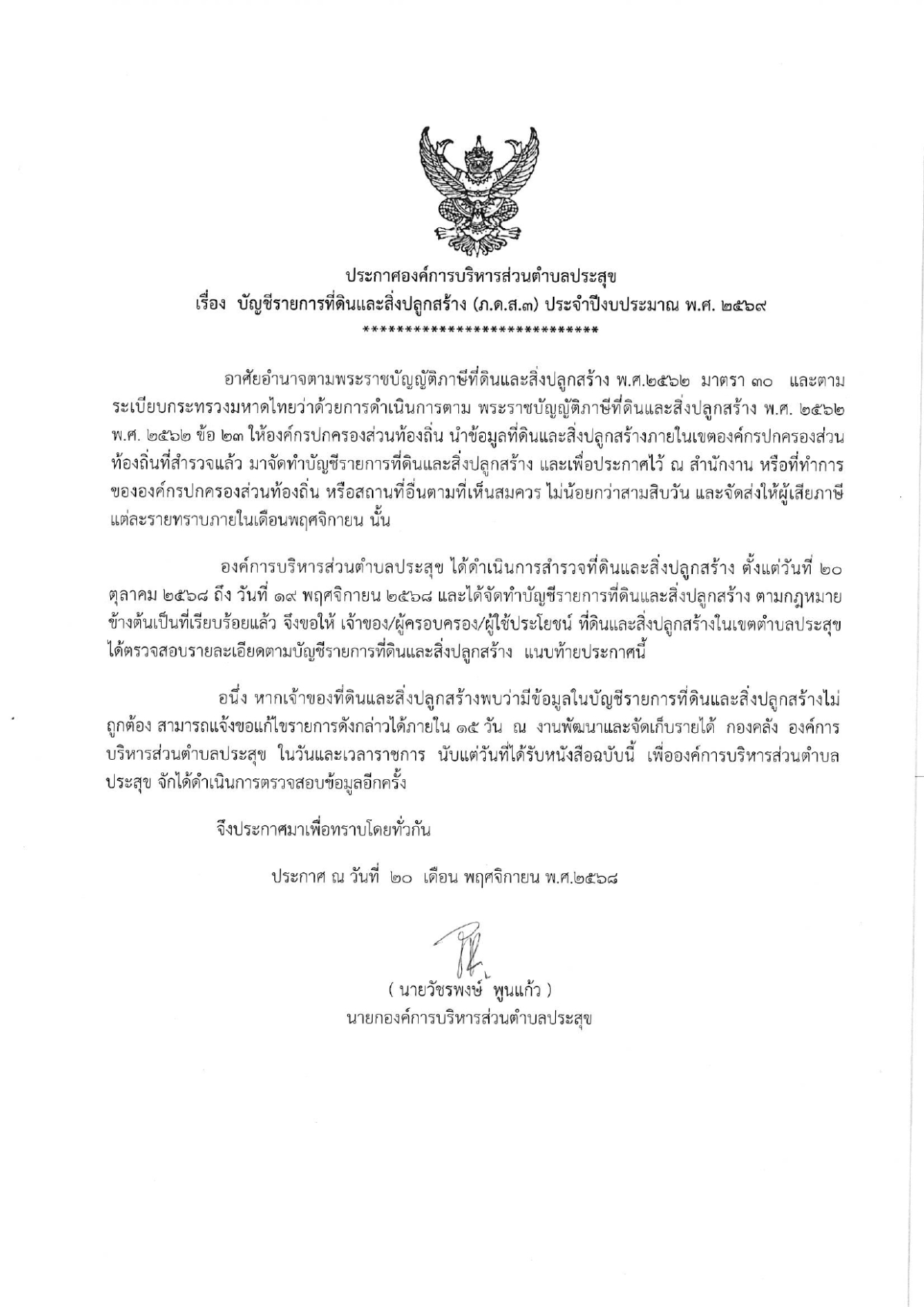 ประกาศองค์การบริหารส่วนตำบลประสุข เรื่อง บัญชีรายการที่ดินและสิ่งปลูกสร้าง (ภดส.3) ประจำปี 2568