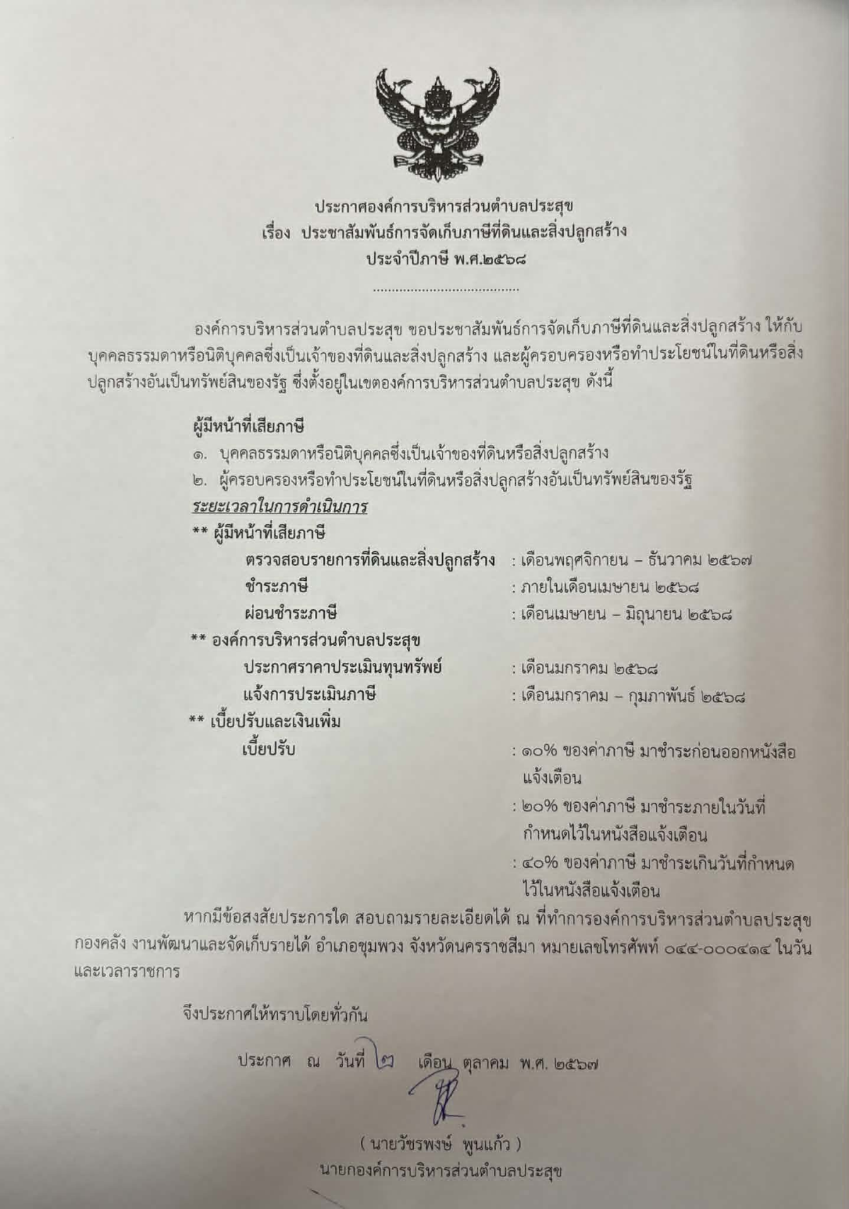 ประกาศองค์การบริหารส่วนตำบลประสุข เรื่อง ประชาสัมพันธ์การจัดเก็บภาษีที่ดินและสิ่งปลูกสร้างประจำปี พ.ศ.2568