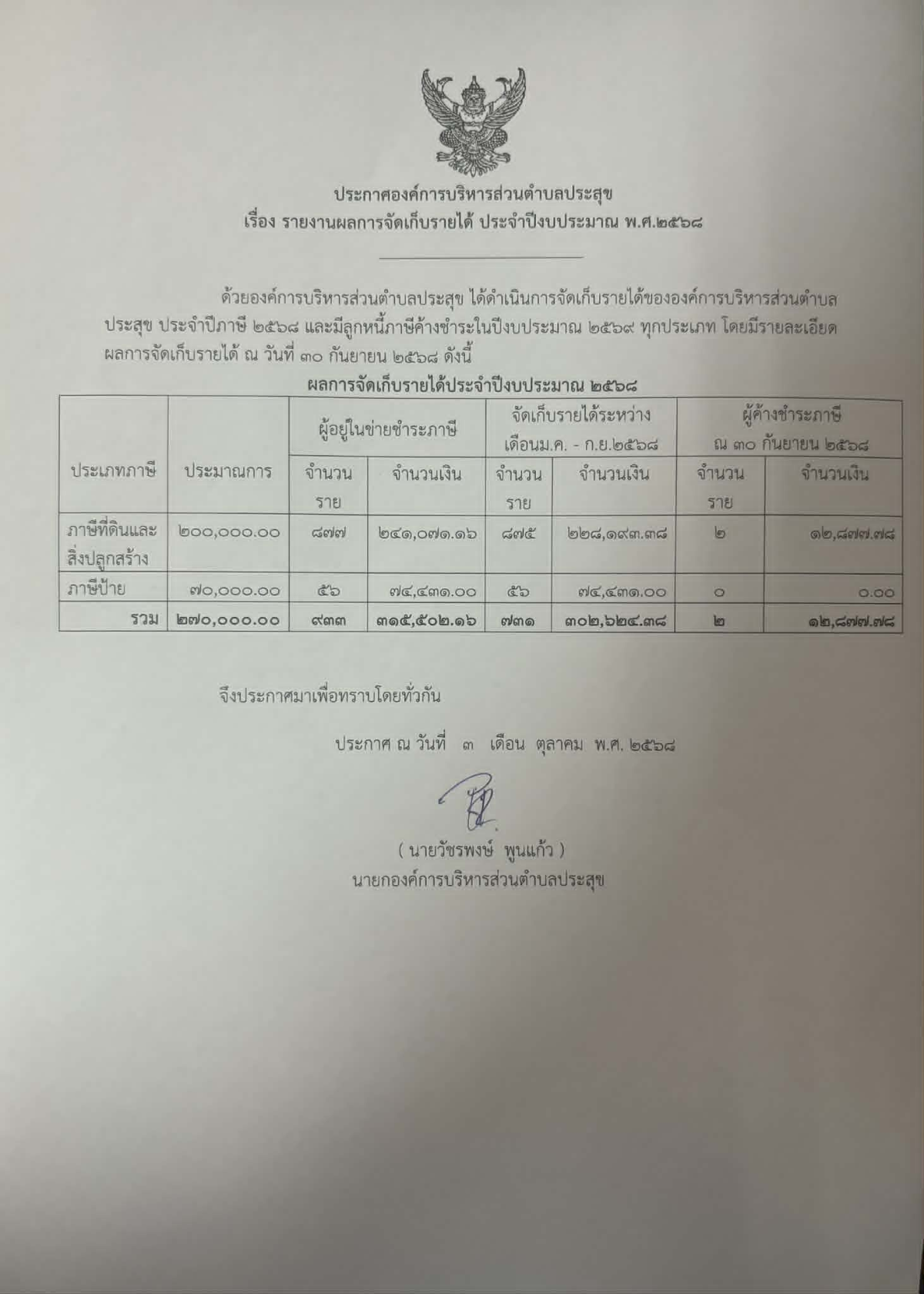 ประกาศองค์การบริหารส่วนตำบลประสุข เรื่อง รายงานผลการจัดเก็บรายได้ ประจำปีงบประมาณ พ.ศ.2568